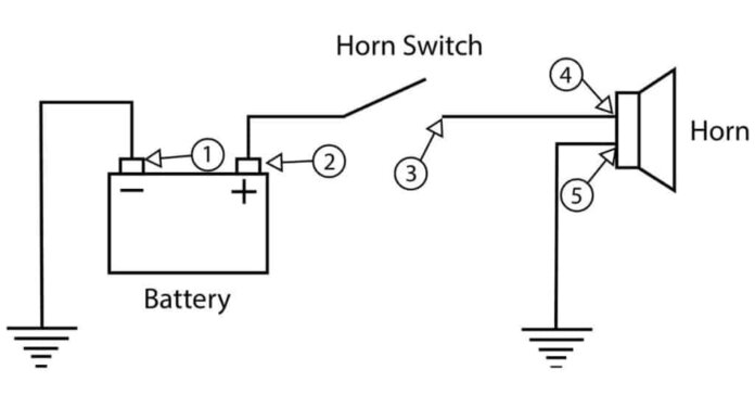 While there are some complicated horn systems on vehicles today, most are generally very simple. We are going to start simple. We are going to walk through this basic horn schematic below and find out how we can test it and how to fix a car horn.
